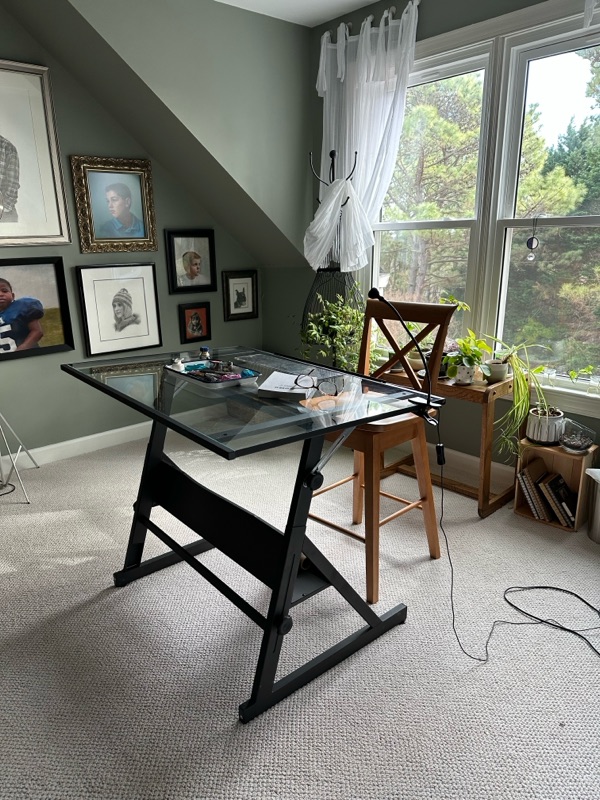 Over the past 30 years, we have had the opportunity to move 11 times, some of our houses had a designated studio space that I claimed and sometimes I had a studio space outside the home. Since most of art furniture consists of easels but I knew I wanted to purchase a table to devote to drawing. With a small budget and a small space to fill, I chose a modestly priced glass topped drawing table. It seemed like it checked the most boxes at the time. Three moves and some years later, I consider that table one of my most used pieces.